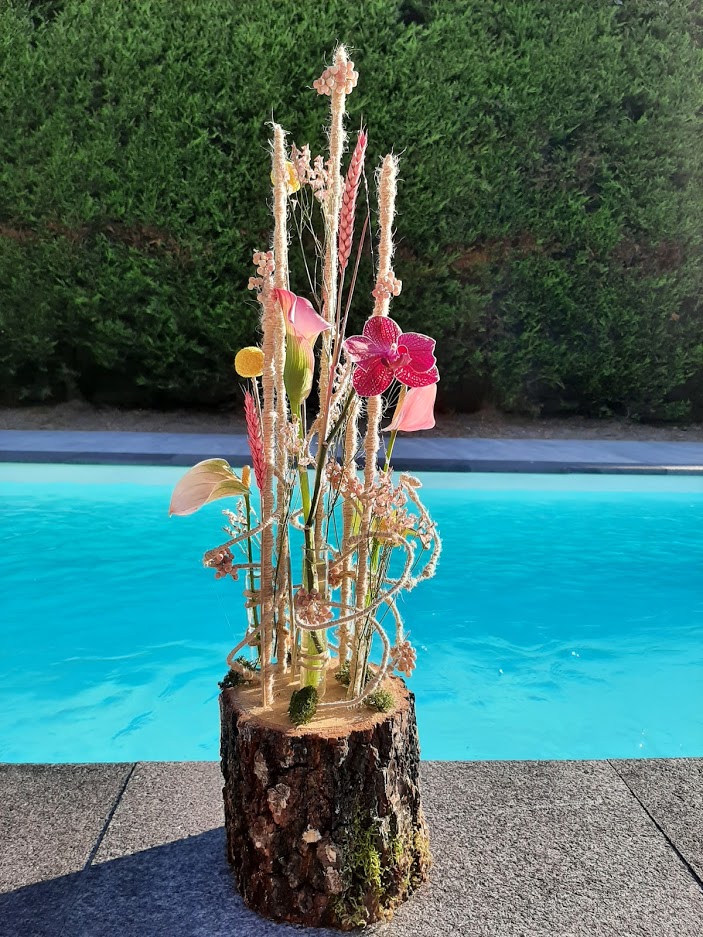 Een creatie op een boomstammetje met diverse bloemen/ droogbloemen. Ook zitten er glazen buizen in waar bloemen in staan. de buizen kunnen er op gemakkelijke manier uit gehaald worden.